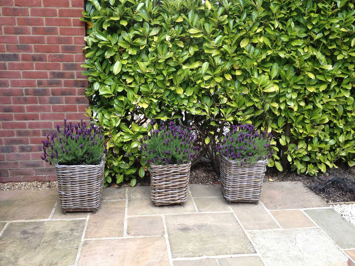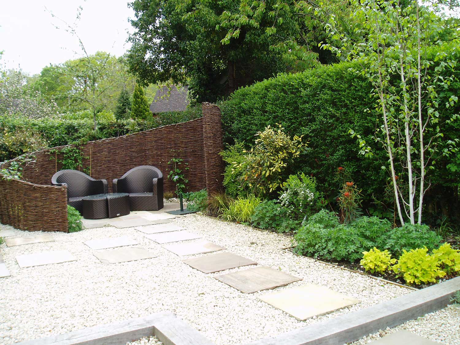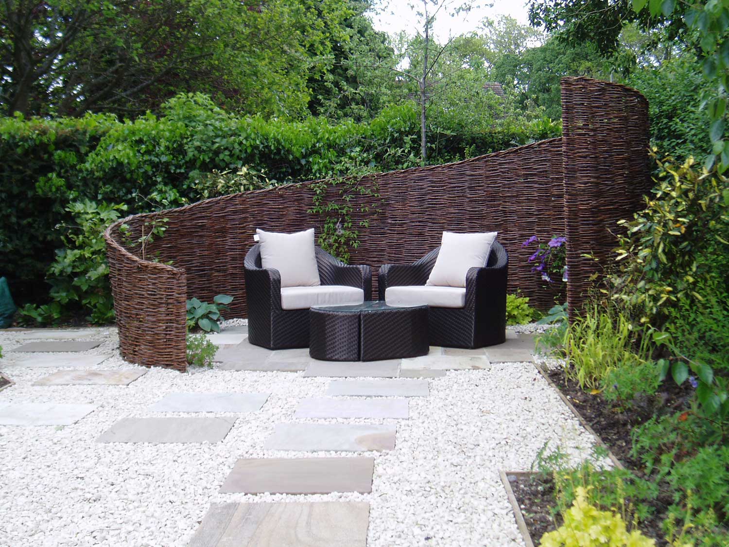 Our design solution was to remove the lawn, extend the paving area and create a second seating area at the far end of the garden. To give a sense of enclosure to this new seating area, we commissioned a custom-made curved woven Willow screen which would wrap round the paving.
