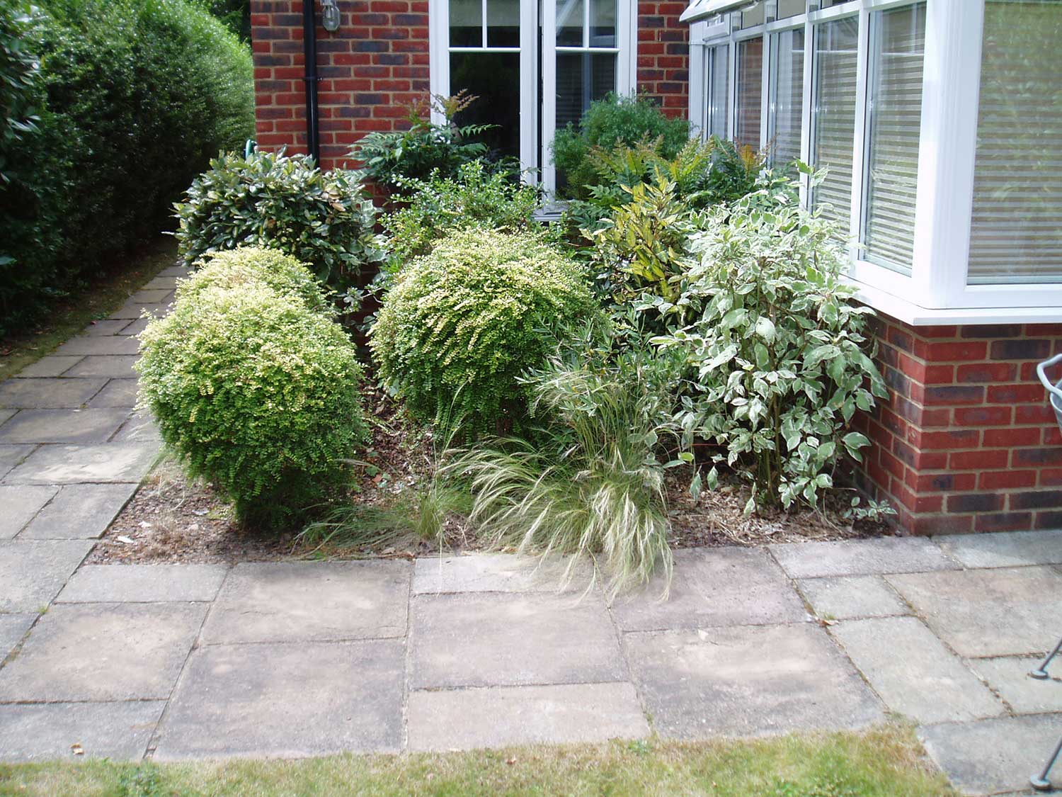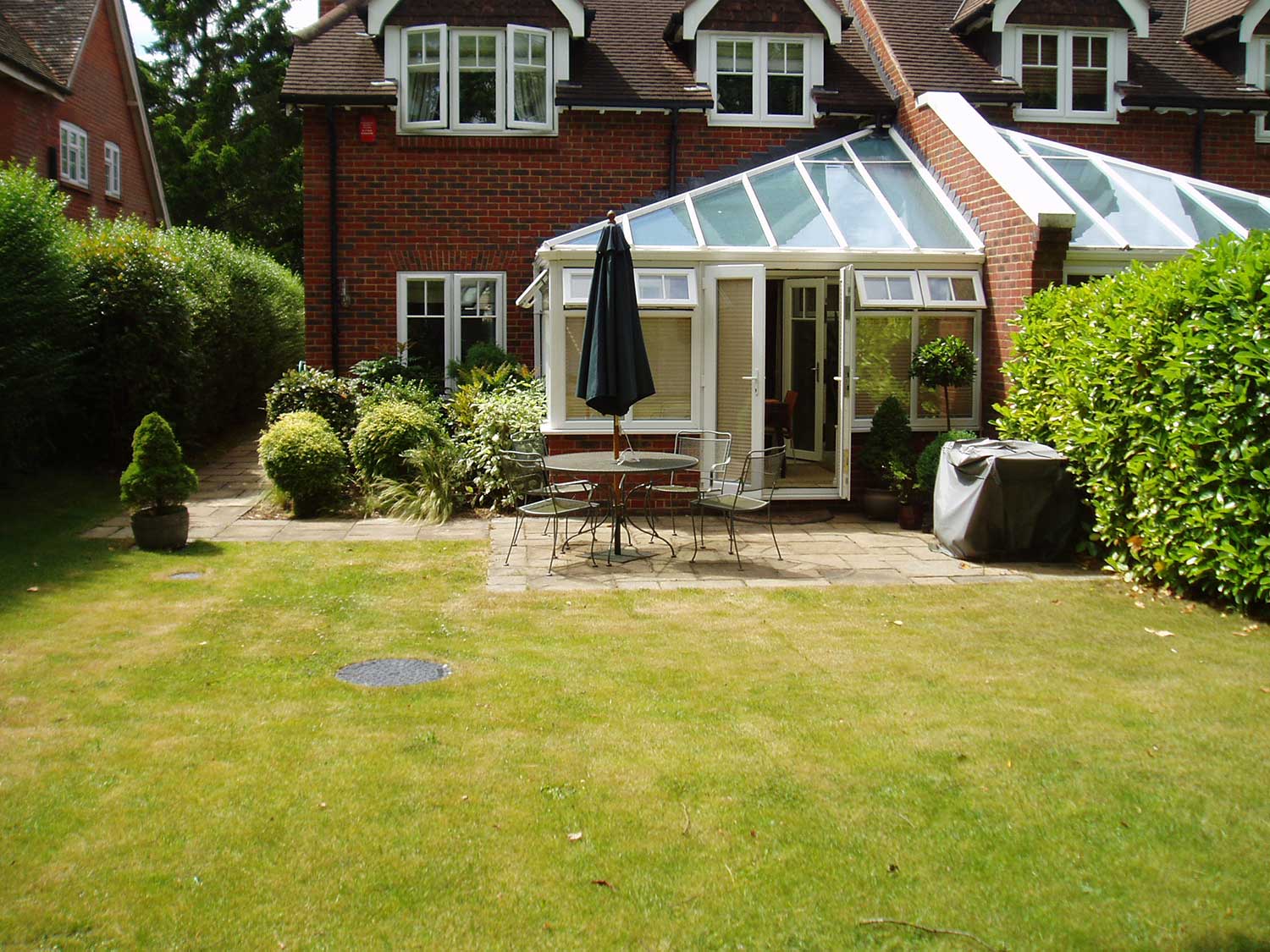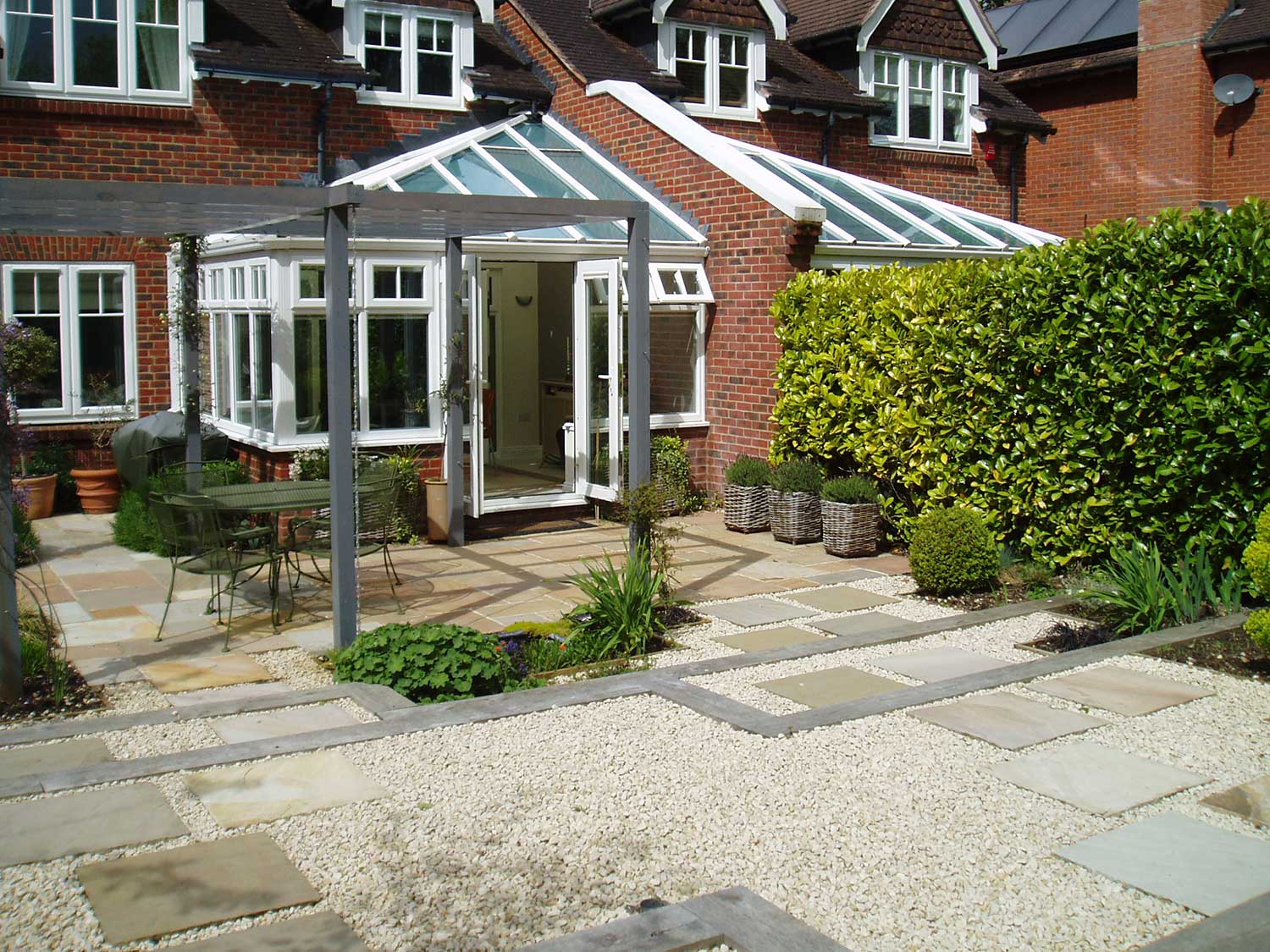 Our clients were a retired couple who had bought a new house in Cranleigh. Like all new houses, the builders had laid a very small area of paving with a not very imaginative layout. The garden was laid mainly to lawn, which was a chore to mow, and there was an area of mature planting taking up valuable space in the far corner. A low maintenance garden was requested, with a larger terrace which could be shaded by plants on a pergola. An existing shed had to remain.