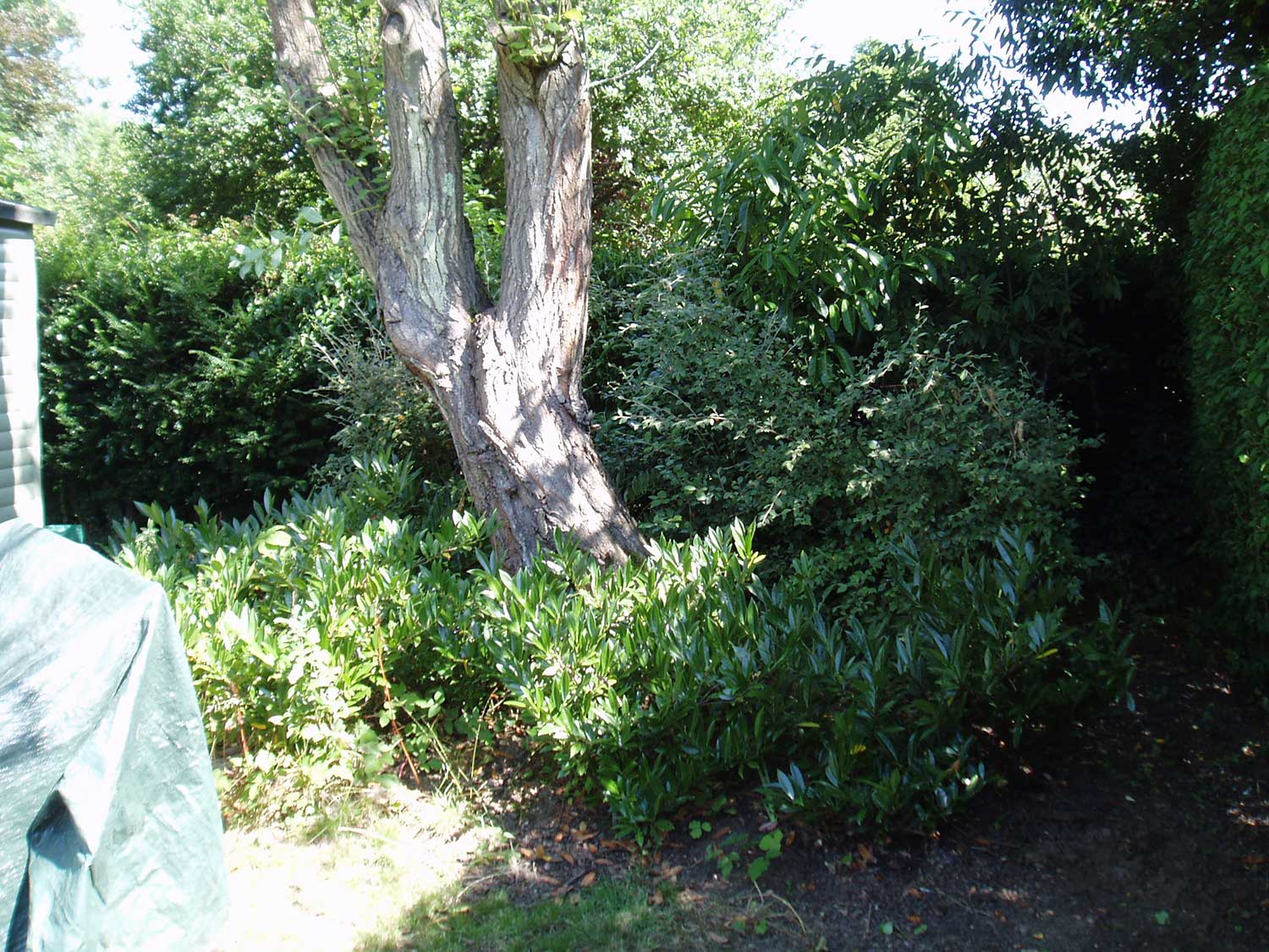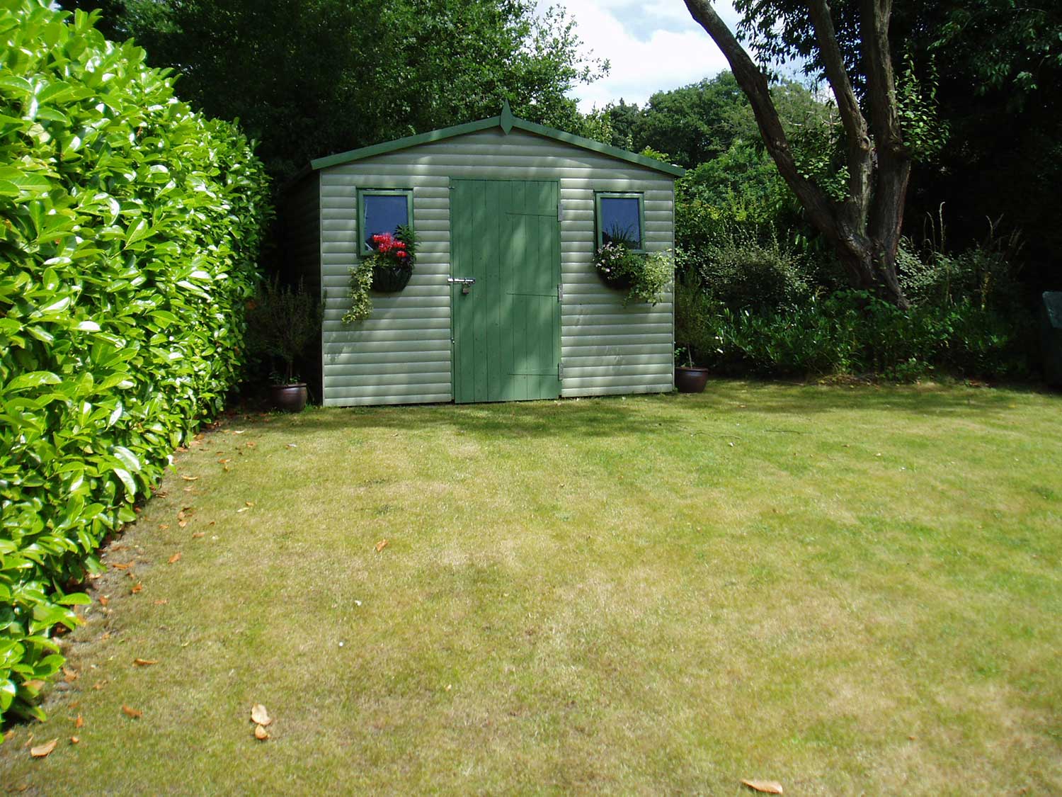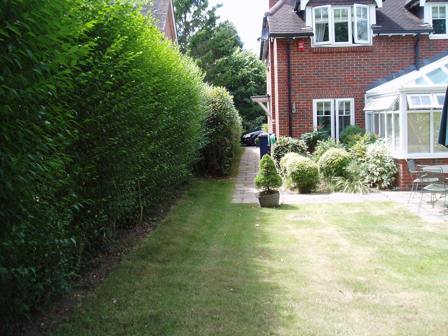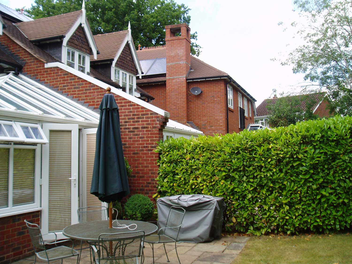Our clients were a retired couple who had bought a new house in Cranleigh. Like all new houses, the builders had laid a very small area of paving with a not very imaginative layout. The garden was laid mainly to lawn, which was a chore to mow, and there was an area of mature planting taking up valuable space in the far corner. A low maintenance garden was requested, with a larger terrace which could be shaded by plants on a pergola. An existing shed had to remain.
