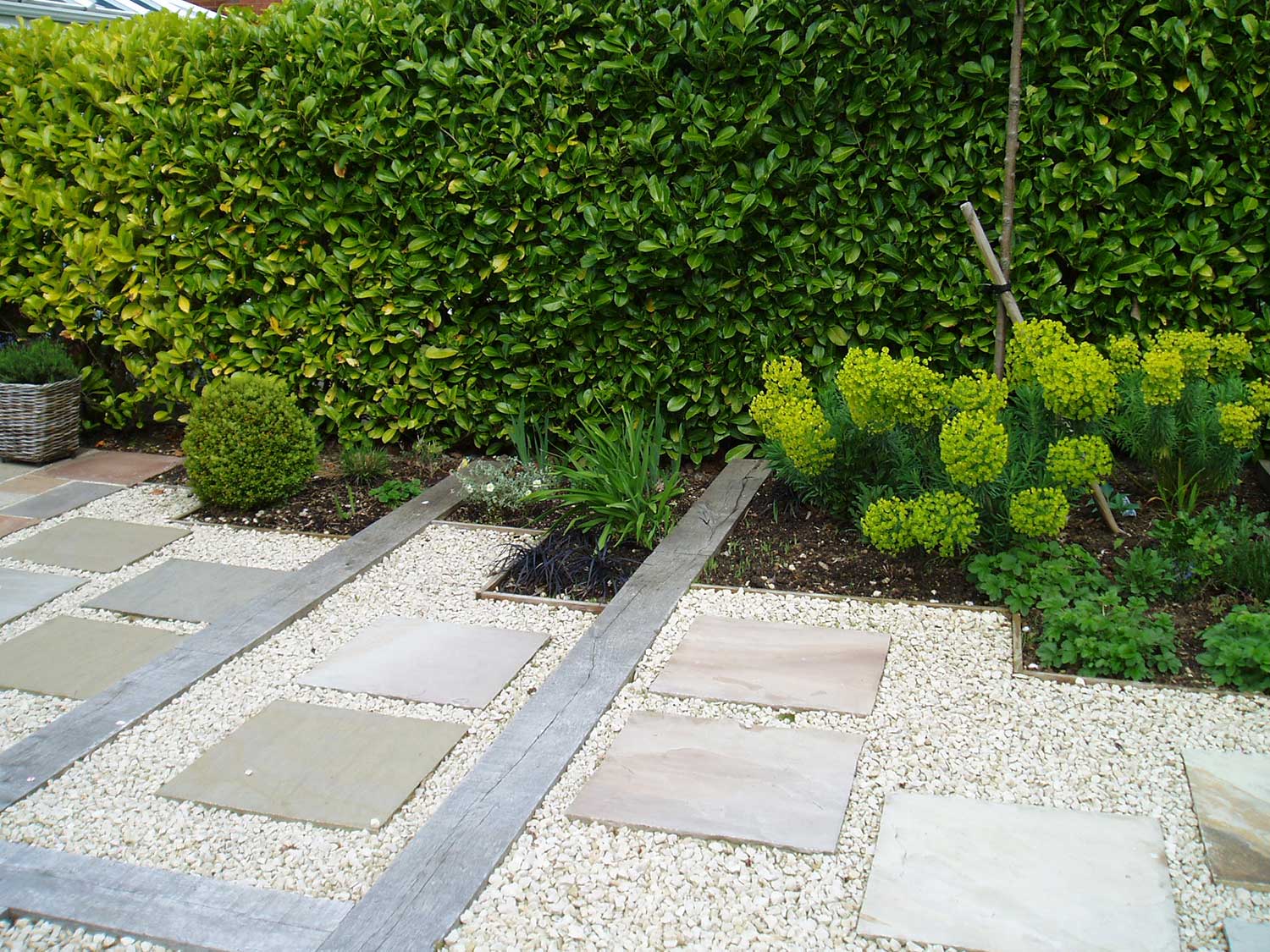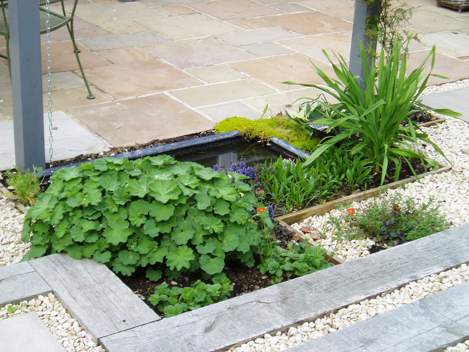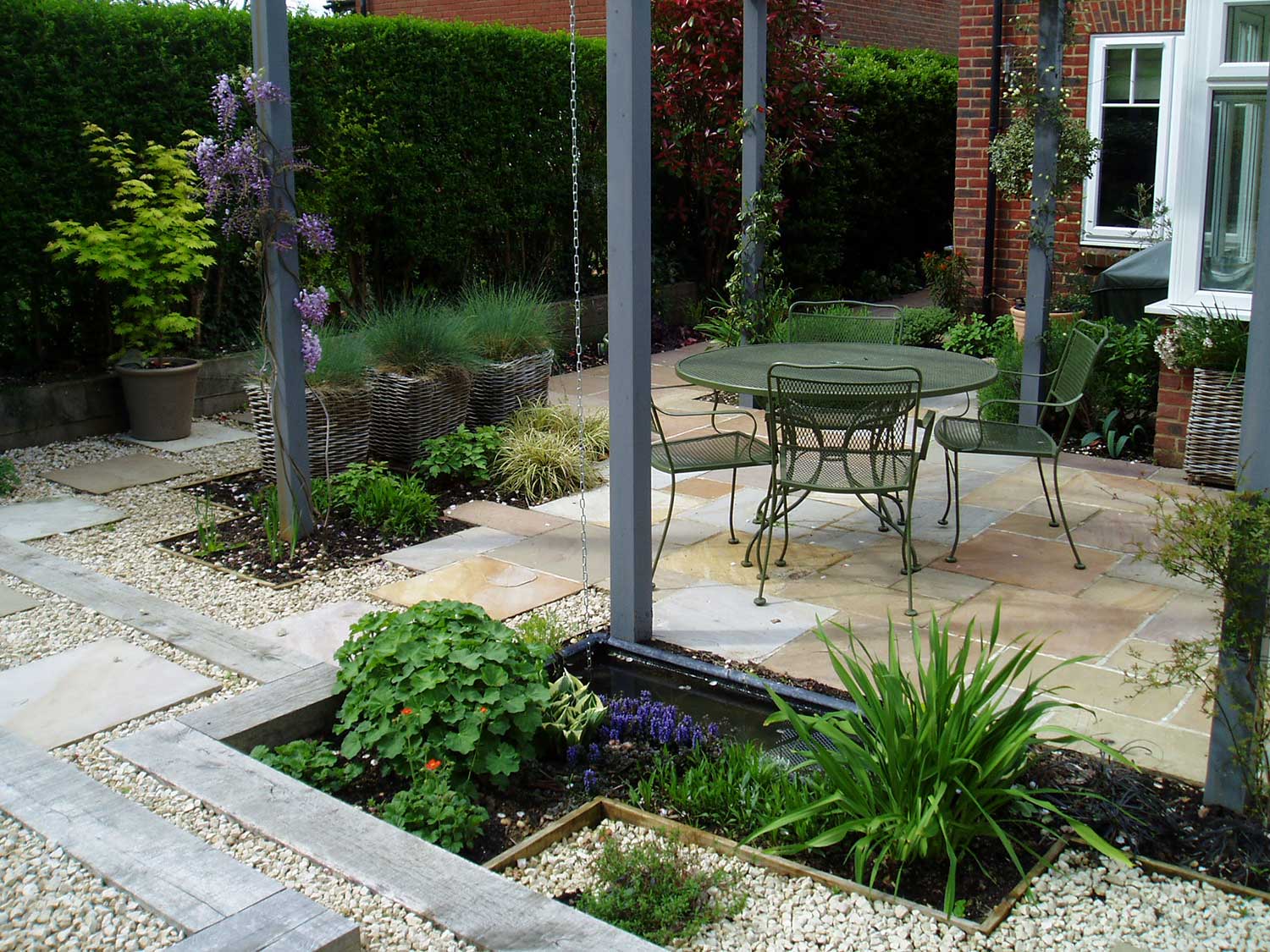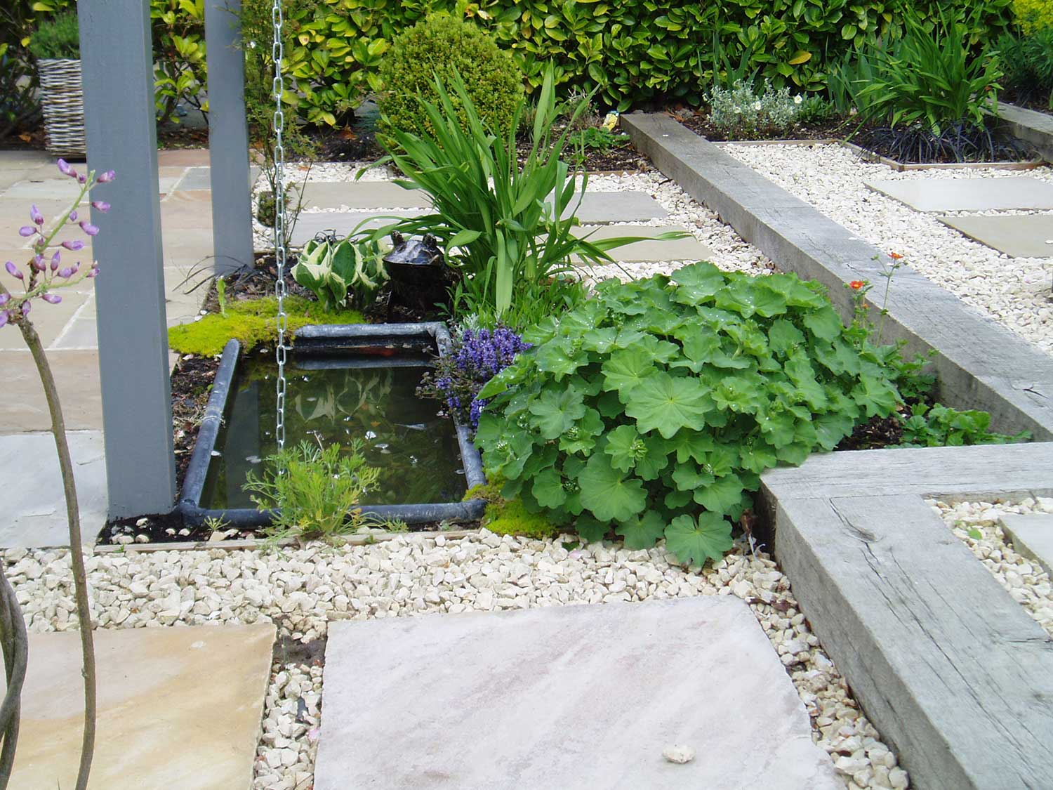 The route to the new seating area was formed by stepping-stones, set in Cotswold chippings which covered the whole area. The slight rise in the garden was dealt with by the installation of Oak sleeper steps, which run right across the garden. A contemporary metal pergola was custom-made to span the paving in a staggered layout. A new water feature was incorporated which has a gentle drip of water running down a chain, off the pergola into a metal reservoir set into the ground.
