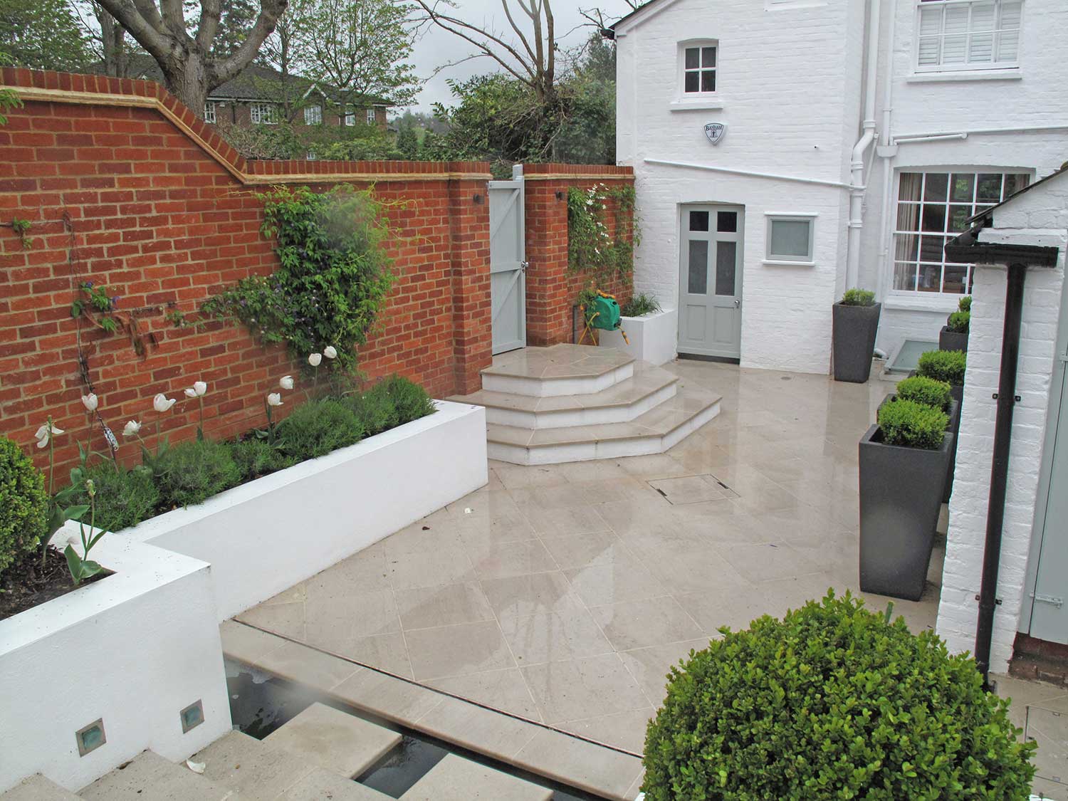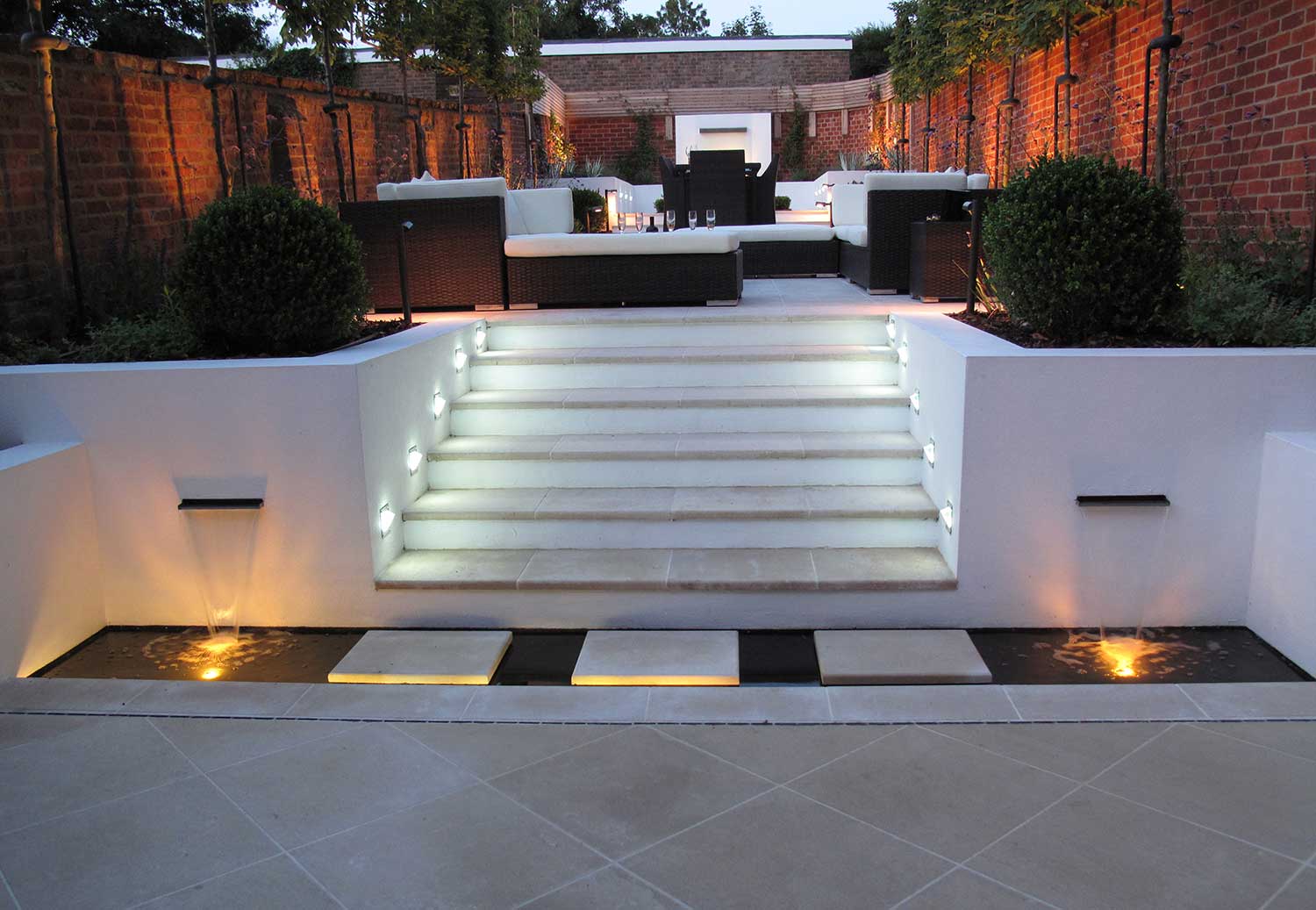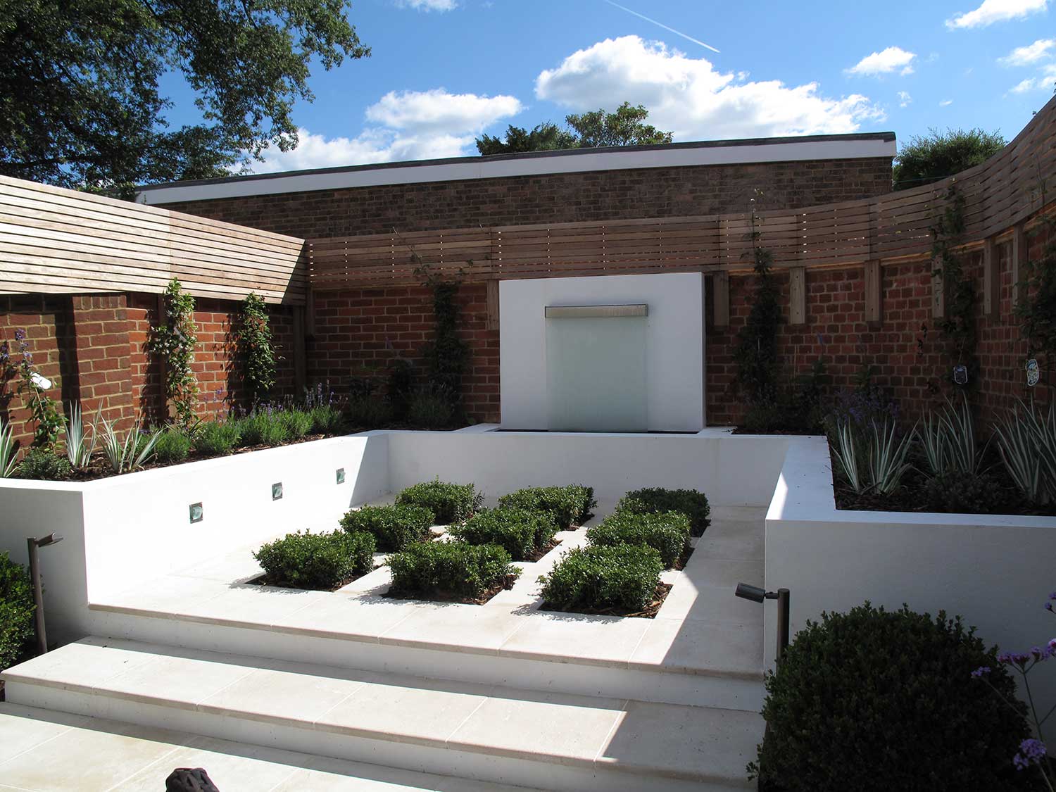First, we replaced a crumbling boundary wall and removed a number of mature trees. Water is a key feature of the garden with three separate fountains. Portland stone was chosen for the paving and a band of artificial turf provides a decorative frame around the dining area. A blue/purple and white colour scheme was chosen for the planting, including Salvias, Agapanthus and Verbena Bonariensis. Pleached Hornbeams and horizontal slat trellising give additional boundary screening. A lighting scheme brings the whole garden to life at night.
