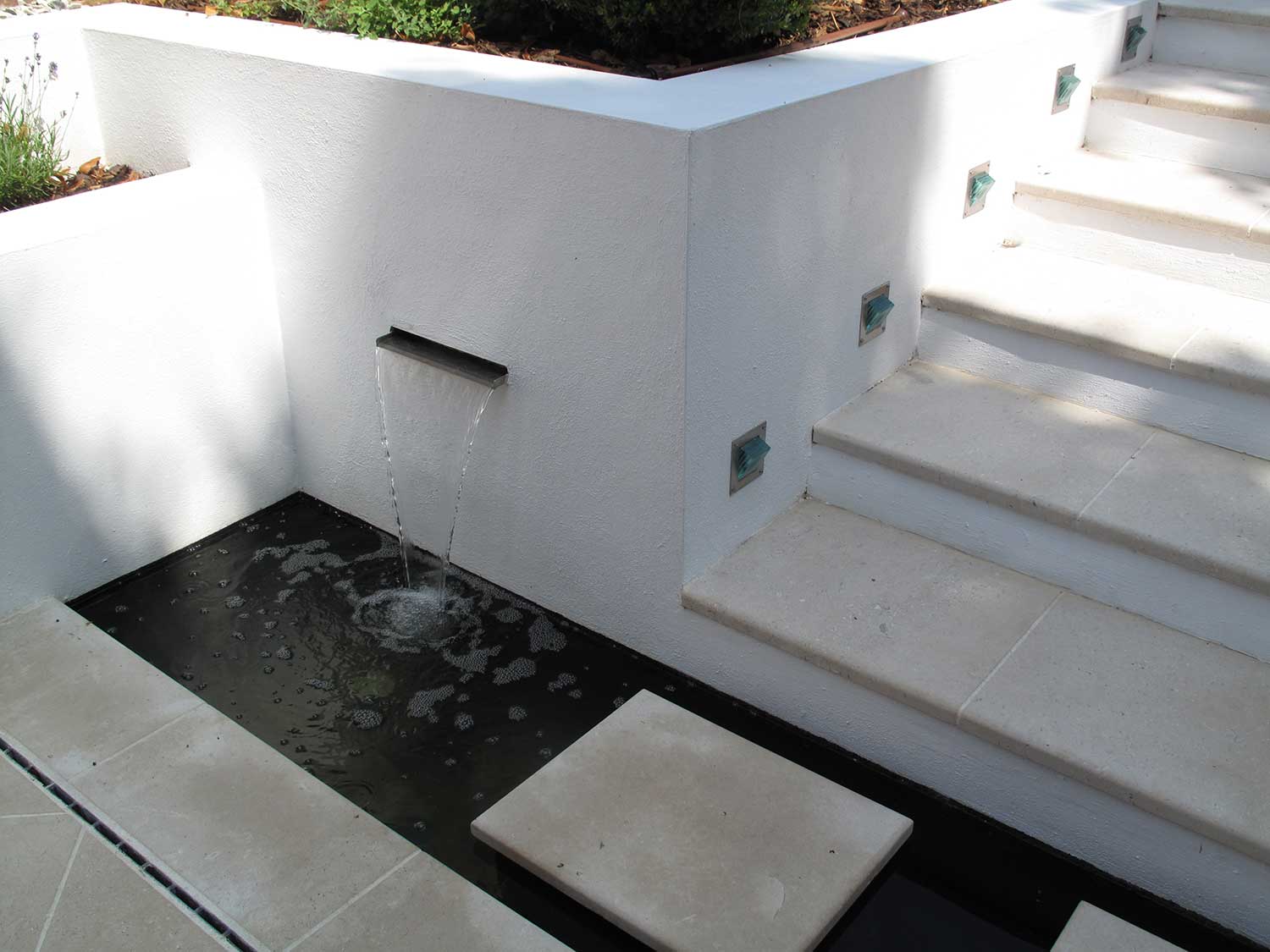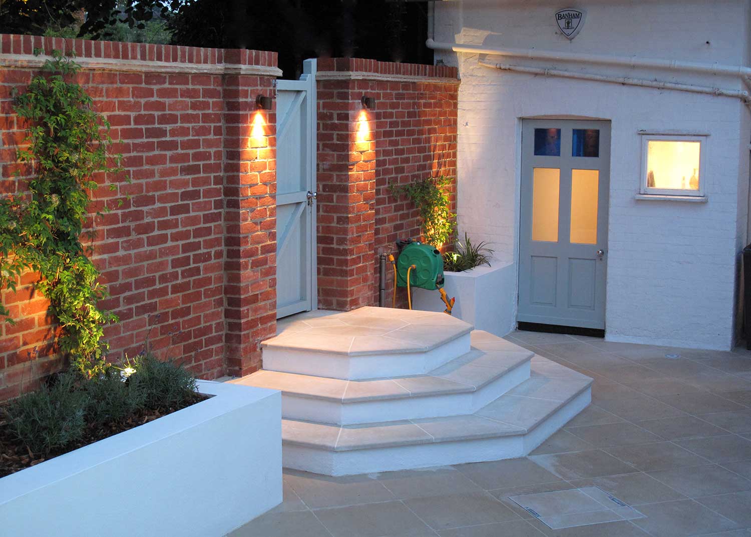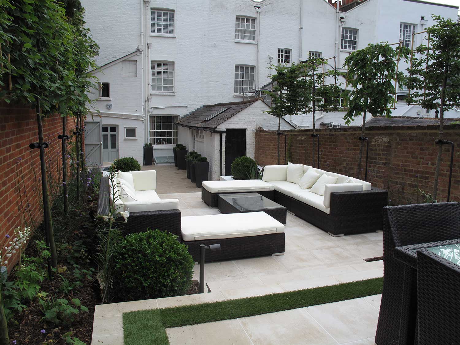 First, we replaced a crumbling boundary wall and removed a number of mature trees. Water is a key feature of the garden with three separate fountains. Portland stone was chosen for the paving and a band of artificial turf provides a decorative frame around the dining area. A blue/purple and white colour scheme was chosen for the planting, including Salvias, Agapanthus and Verbena Bonariensis. Pleached Hornbeams and horizontal slat trellising give additional boundary screening. A lighting scheme brings the whole garden to life at night.