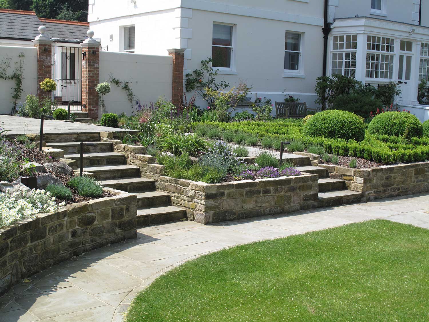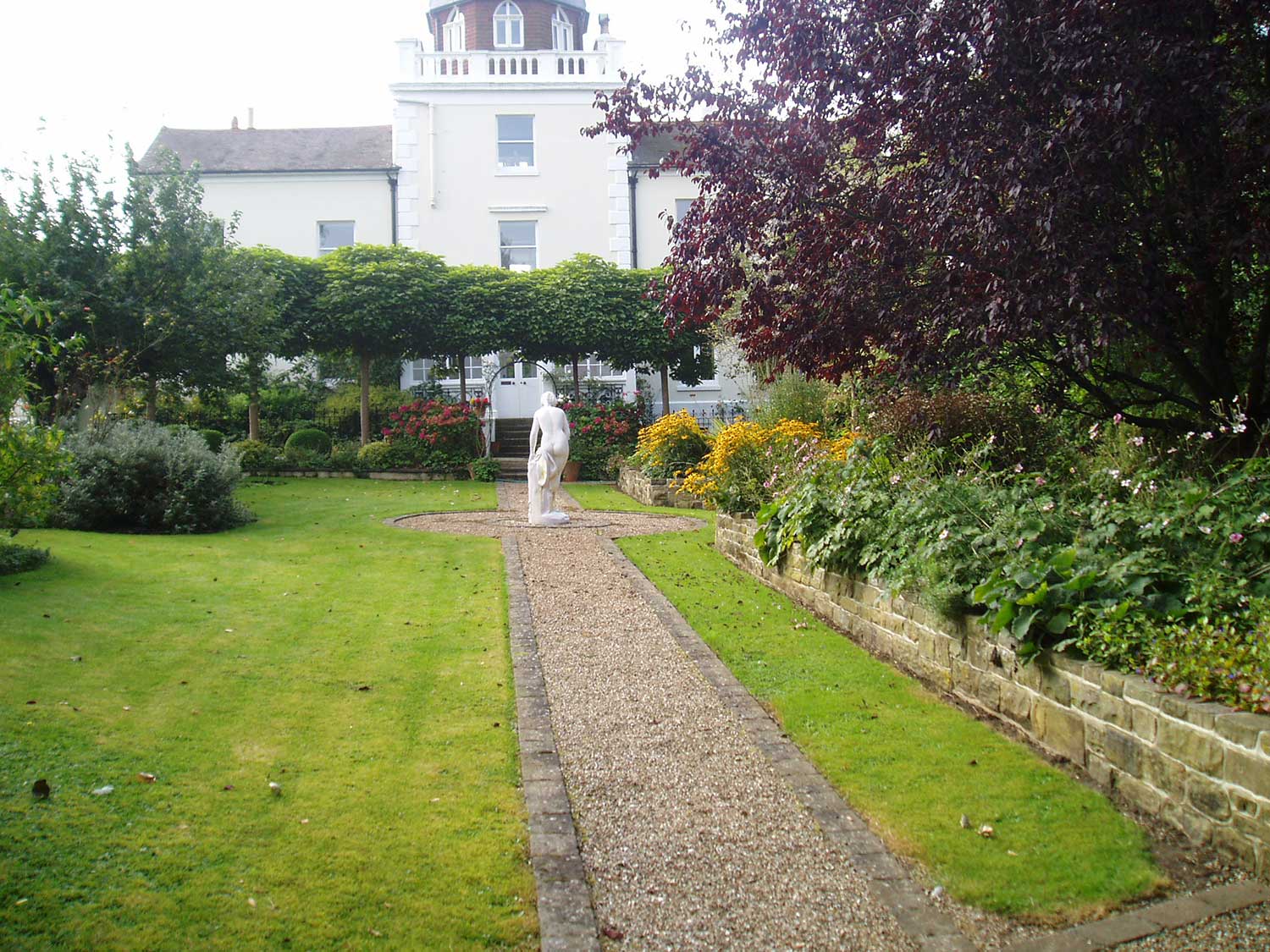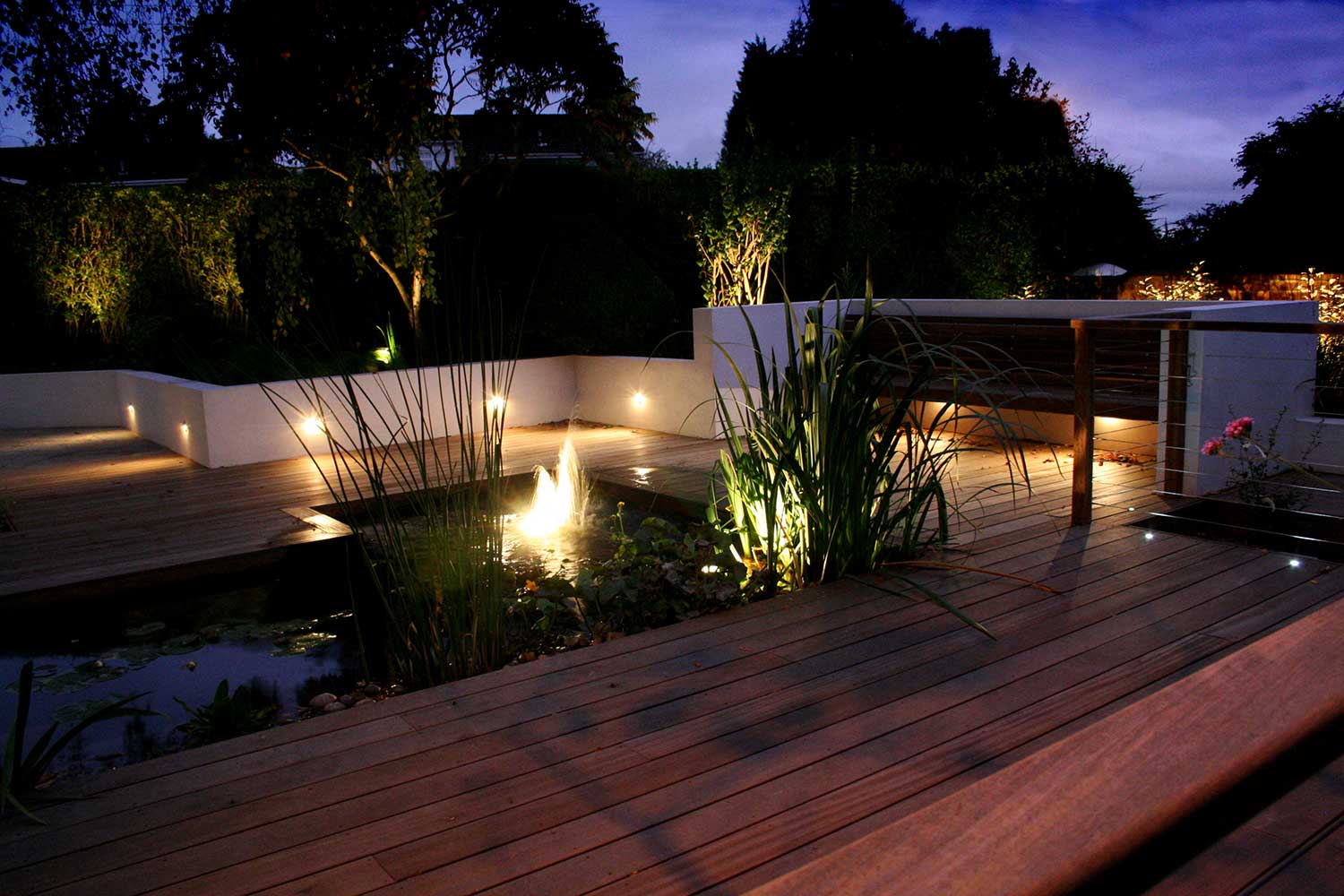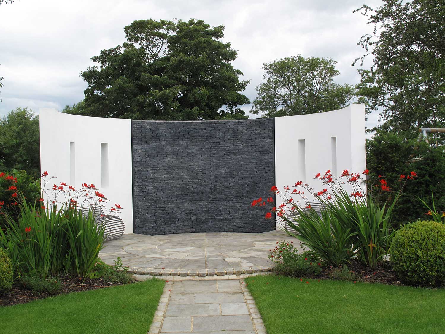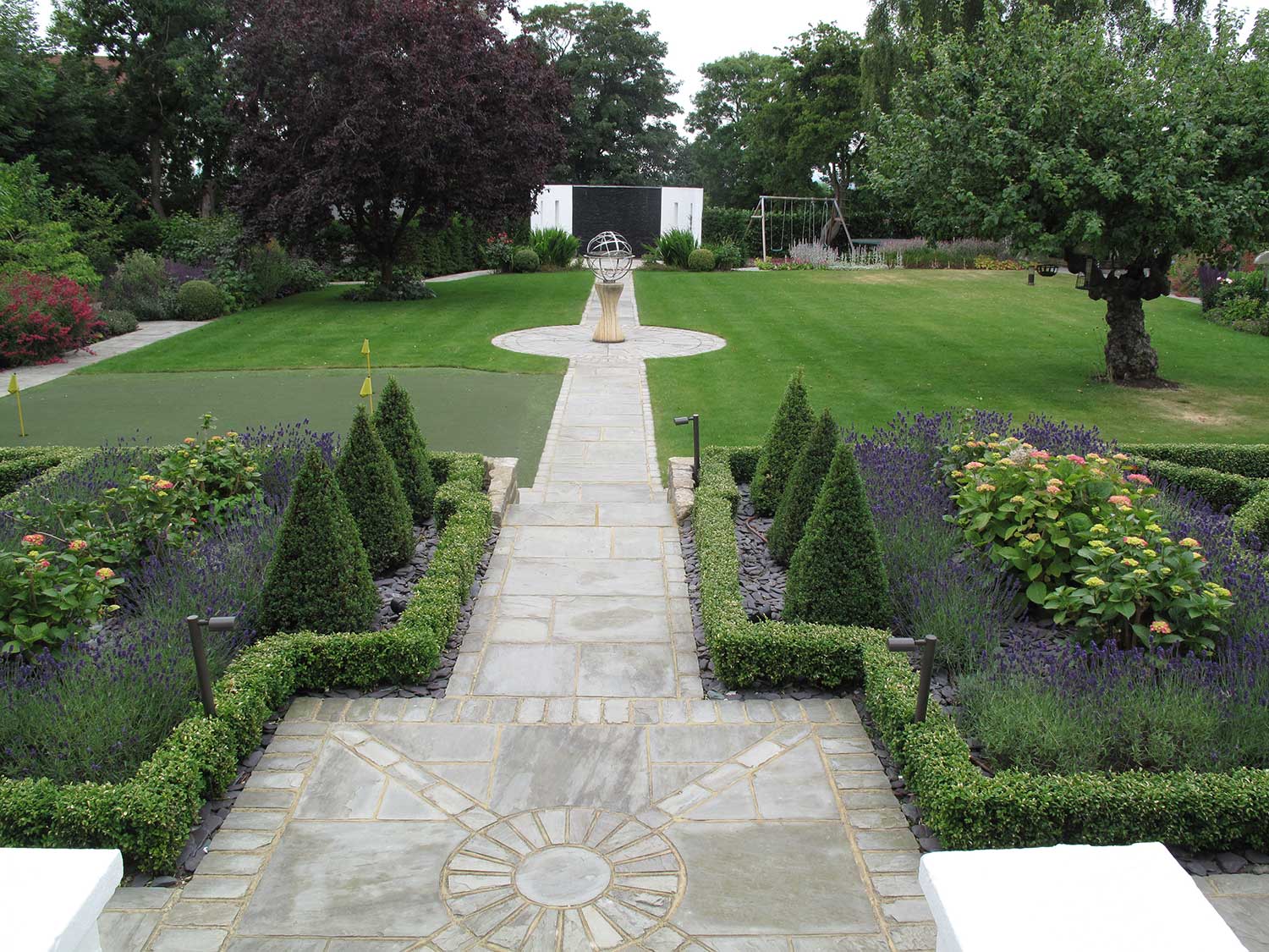 Our new garden design opens views across the garden, enlarges the lawn and creates new paths and neater planting areas. A large slate waterfall is now the focal point at the end of the garden. The pond has been restored with a hardwood deck constructed around it. There is a new dining terrace with feature sculpture on a wall, a play area with swings and a formal Box parterre around existing large Box balls. Existing walls and entrances were altered to create an entrance courtyard. A lighting scheme brings the property and its new features to life at night.