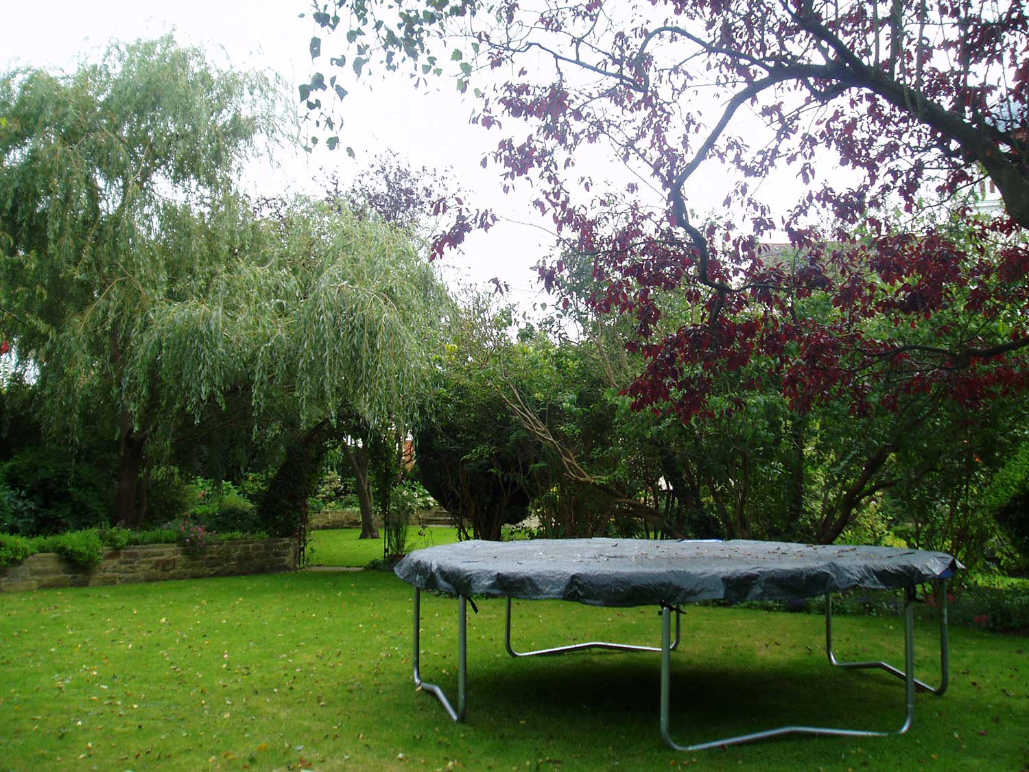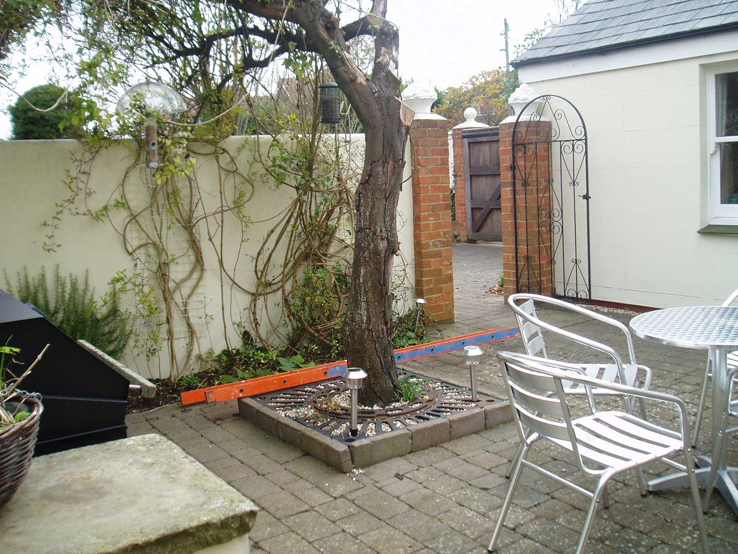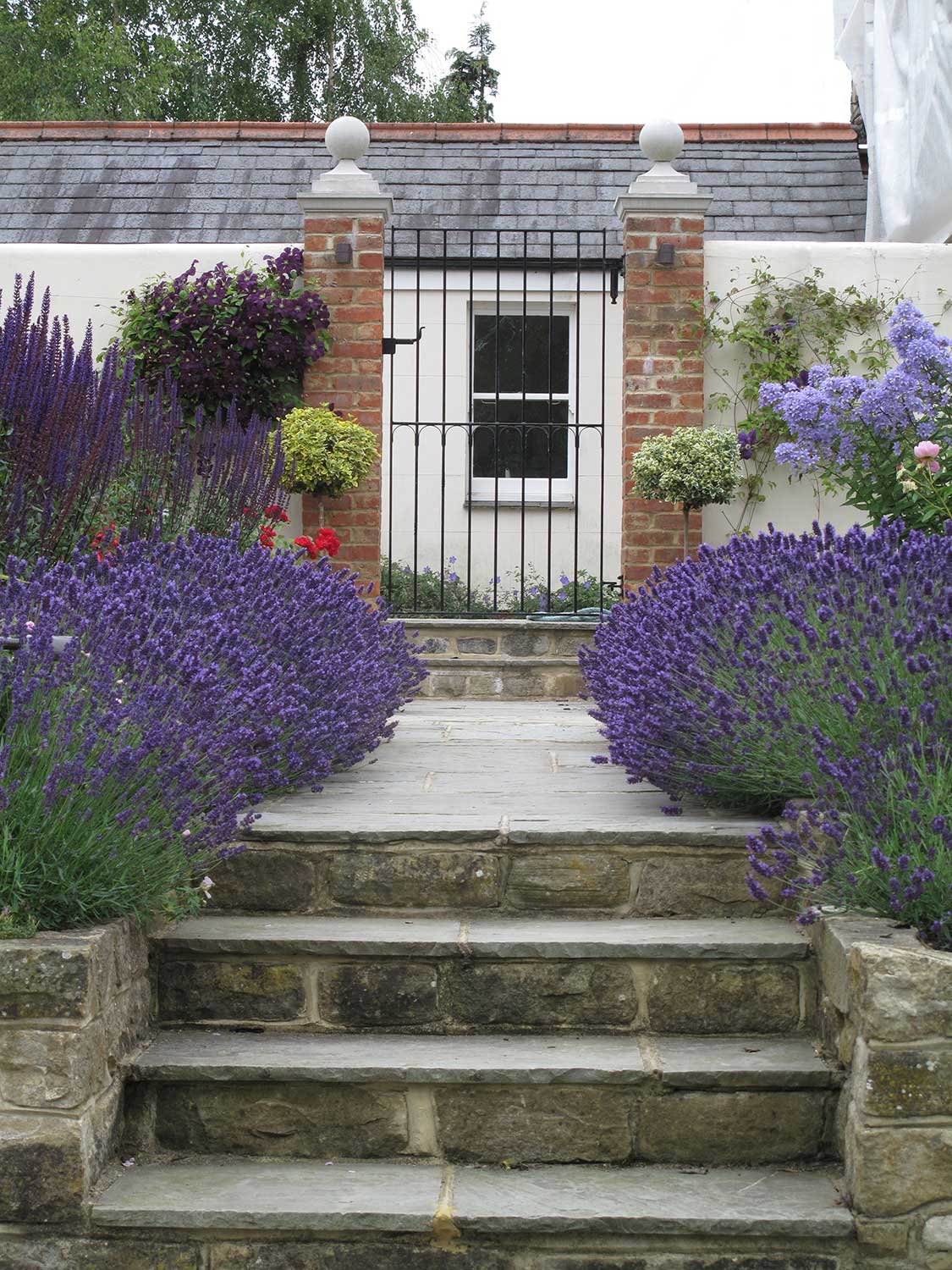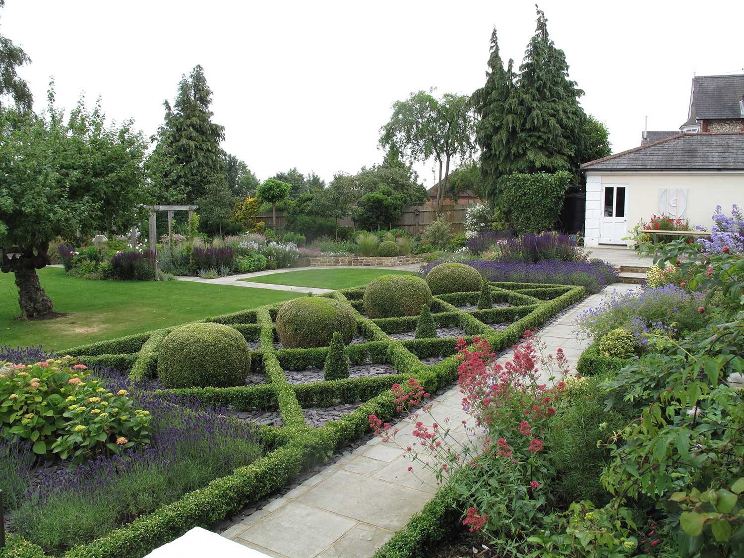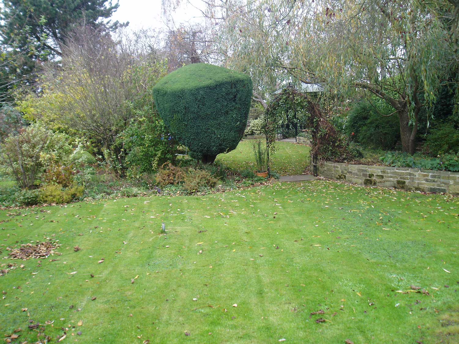 Our new garden design opens views across the garden, enlarges the lawn and creates new paths and neater planting areas. A large slate waterfall is now the focal point at the end of the garden. The pond has been restored with a hardwood deck constructed around it. There is a new dining terrace with feature sculpture on a wall, a play area with swings and a formal Box parterre around existing large Box balls. Existing walls and entrances were altered to create an entrance courtyard. A lighting scheme brings the property and its new features to life at night.