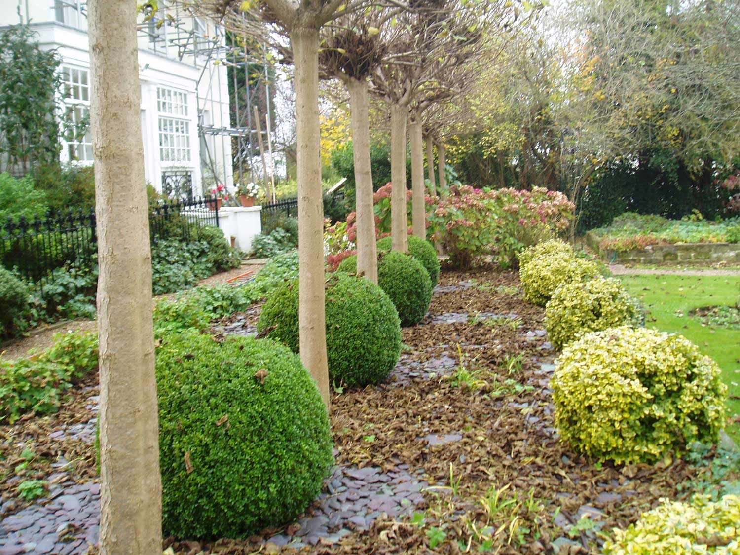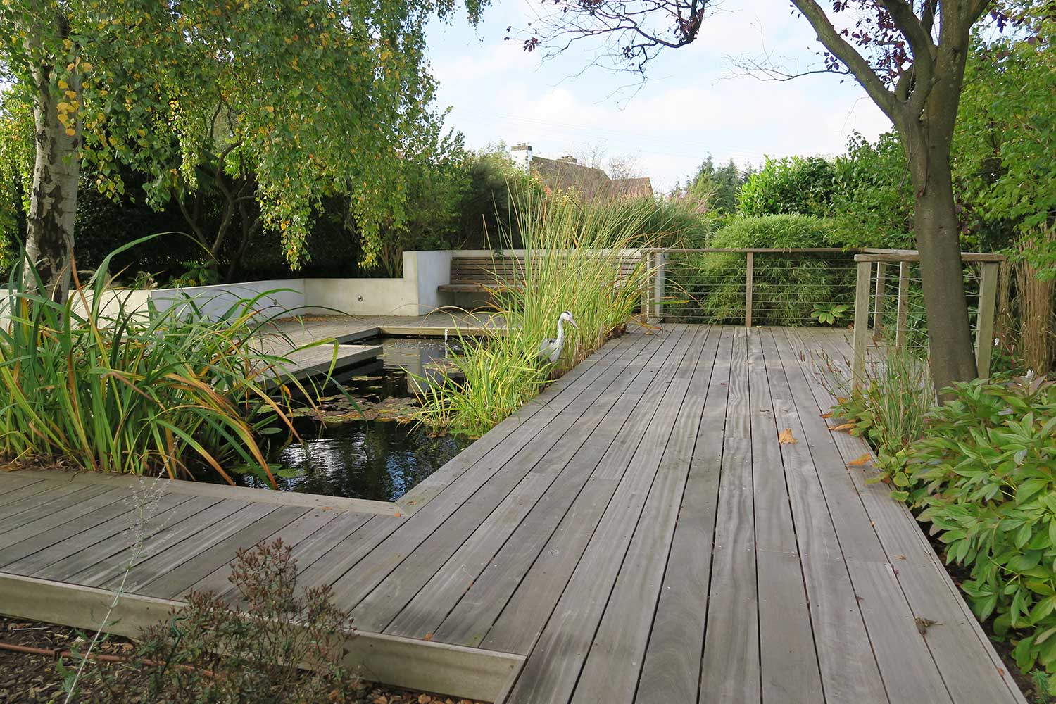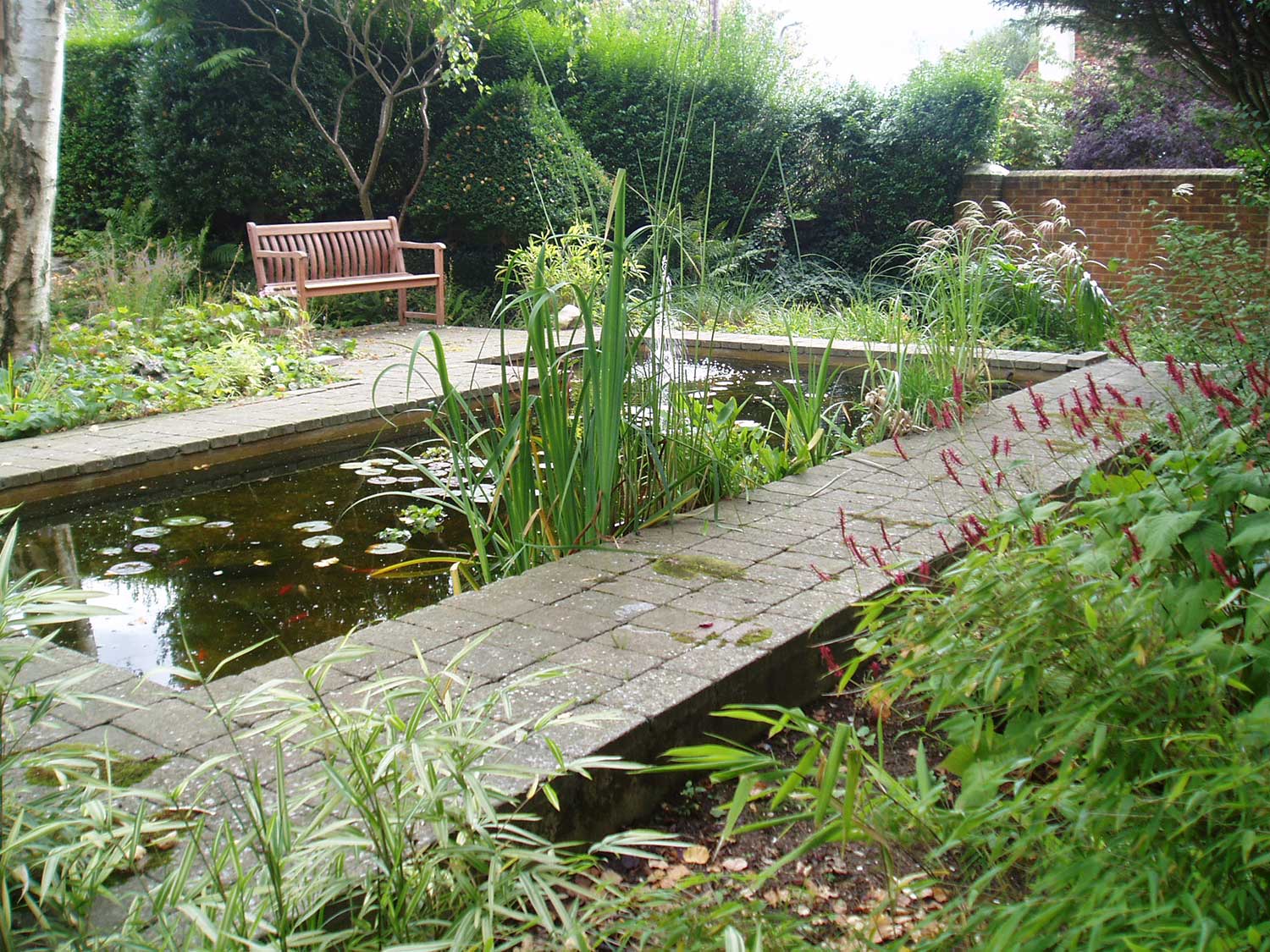 Our clients had recently purchased this Listed house, but the layout of the garden did not provide them with enough play space for their growing family or reflect their preference for contemporary design. Too many shrub borders took up lawn space and concrete driveway pavers had been used for paths throughout the garden. An existing pond needed refurbishment.